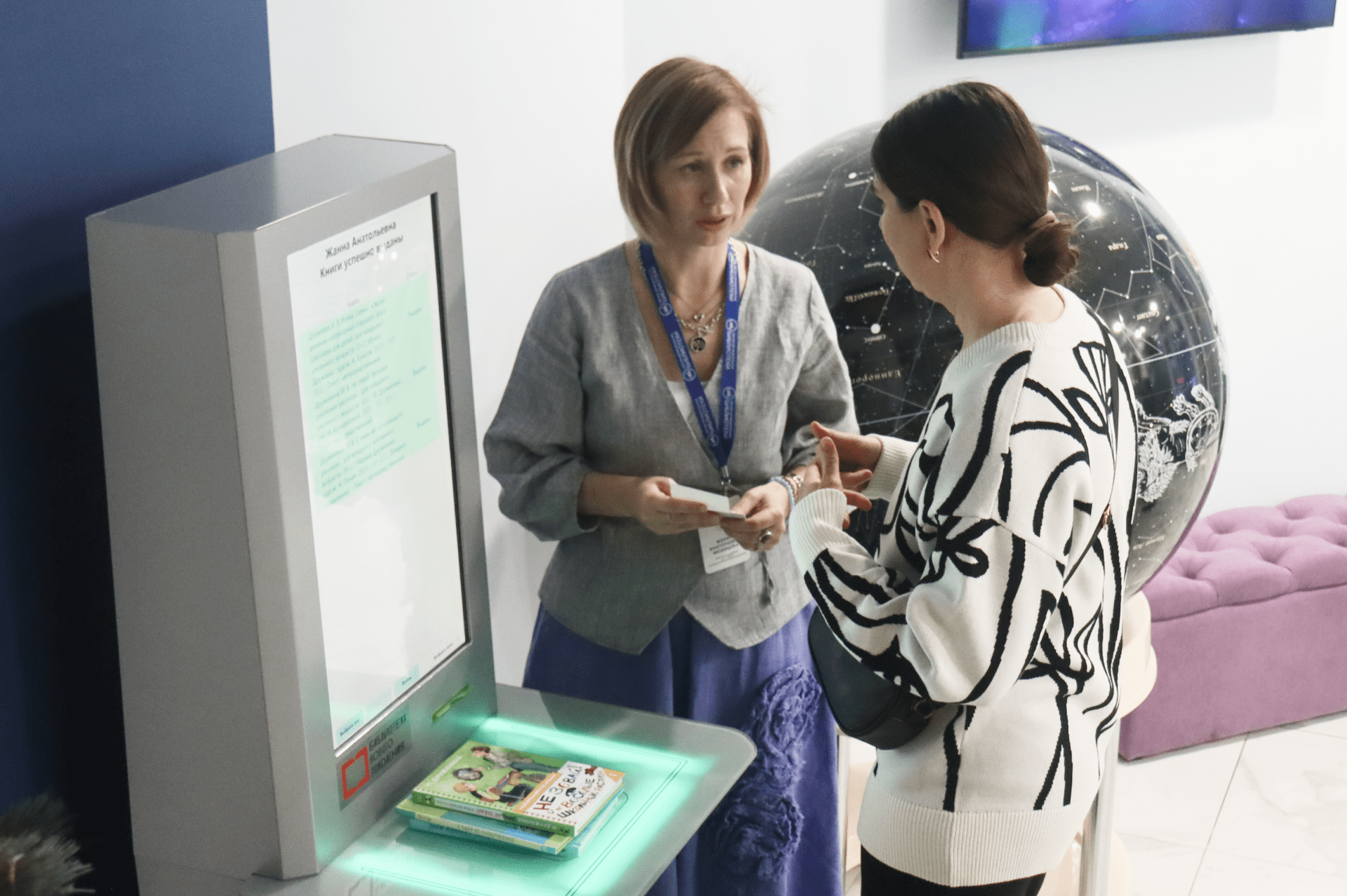 Ключевым технологическим элементом библиотеки стала станция автоматической книговыдачи от «РСТ-Инвент» для бесконтактной выдачи и возврата литературы. Все издания теперь оснащены RFID-метками BiblioTag, поэтому читателю не нужно обращаться к библиотекарю. Чтобы взять или вернуть книги, достаточно положить их на станцию — система автоматически распознает все экземпляры и сразу зафиксирует операцию в электронном читательском билете. Станция выполнена в серебристом матовом корпусе и органично вписана в «космический» дизайн библиотеки.