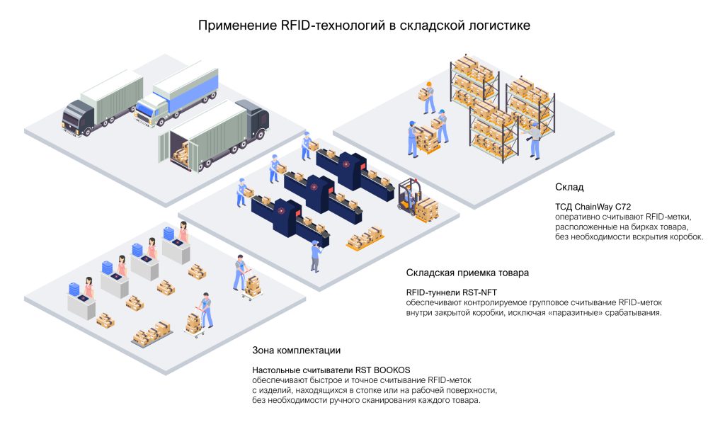 - Повышение точности приемки. Переход от поштучного сканирования товаров к бесконтактному групповому считыванию RFID-меток снизил количество ошибок на 90%.